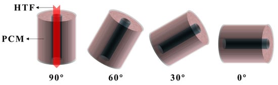 In order to conduct the exergy analysis of a solar thermal storage system, a shell and tube TES unit with multiple operating conditions established by Peng et al. [40] was applied to evaluate the exergy and exergy efficiency for different inclination angles, inlet conditions, and original conditions. The configuration of different inclination angles studied in the reference and this paper is shown in Figure 1, and the variable and constant conditions are listed in Table 1. The variation pattern of the thermal performance and the mechanism of systematic thermodynamic loss are also discussed. Table 1 also displays the different effect cases, and the inlet intensity shown as Re and the heat transfer driving force shown as Ste are calculated to obtain the different working conditions.