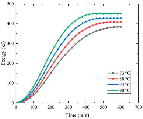 The variation of the exergy for different inlet temperatures is shown in Figure 8. It can be seen that increasing the fluid temperature from 83 to 88 °C increases the exergy from 385.0 to 408.3 kJ. Increasing the fluid temperature from 88 to 93 °C expands the maximum exergy by 20.3 kJ. Raising the fluid temperature by 5 °C further increases the exergy by 23.2 kJ. It can be found that as the fluid temperature increases, the available energy of the system increases, and the variation trend grows. Increasing the fluid temperature causes a significant effect on the energy storage density because it promotes the effective thermal exchange and the PCM final temperature, expanding the deviation from the original state and thus increasing the thermal potential.