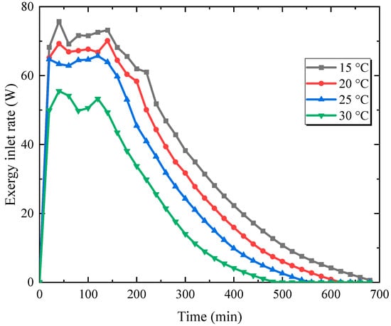 Figure 10 shows the effects of unit original temperatures on the exergy inlet rate when the inclination angle is 60°. The figure shows that increasing the original temperature of the unit reduces the time necessary for the solar water to supply the inlet exergy but also decreases the exergy inlet rate. The maximum exergy inlet rate is 75.7 W when the system’s original temperature is 15 °C. When the system’s original temperature is raised to 20 °C, the exergy inflow rate declines under the same inlet conditions, with a maximum value of 70.1 W. When the temperature is raised to 25 °C, the exergy inflow is reduced even further, and the maximum rate is 65.7 W. When the original temperature is 30 °C, the system has the lowest exergy inlet rate with a maximum value of 55.5 W. Increasing the fluid temperature reduces the heat transfer temperature difference between the solar water and the paraffin, which weakens the thermal transfer intensity and decreases the exergy inlet rate.