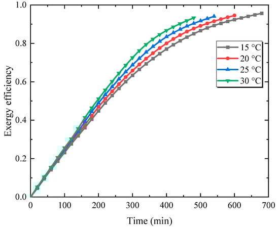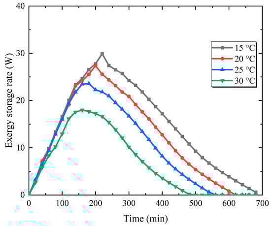 Figure 11 depicts the variation of the exergy storage rate for different original temperatures. As the original temperature of the unit increases, the exergy storage rate decreases due to the influence of the charging fluid. Although increasing the original temperature reduces the charging time, it decreases both the exergy storage rate and the exergy. As a result, raising the initial temperature by 15 °C decreases the maximum exergy storage rate of the phase change material from 29.9 to 18.0 W.