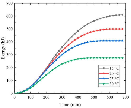 Figure 12 demonstrates the change of the exergy with different original temperatures. From the figure, increasing the original temperature decreases the total available energy gradually. When the PCM temperature is 15 °C, there is a temperature transfer difference between the water and the paraffin, and the system deviates from the original condition after completing the heat storage mostly, so the system maintains the maximum exergy, which is 610.5 kJ. As the PCM temperature is 20 °C, the thermal potential of the unit is weakened, and the exergy is 500 kJ. The original temperature is increased to 30 °C, the exergy is only 275.5 kJ. With the increase in the PCM original temperature, the potential capacity of the system is weakened, the available energy is reduced, and the reduction trend extends.