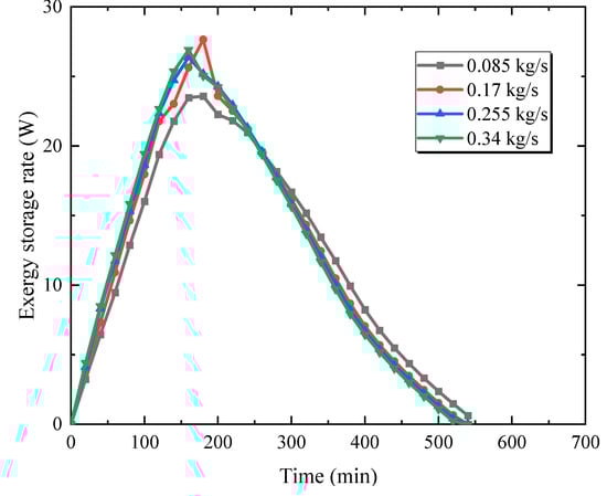 Exergy storage rate for different inlet flow rates.