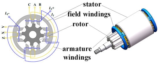 The DSEG-CF with concentrated field windings and DSEG-DF with distributed field windings are the common structures of the DSEG. The structure of a DSEG-CF is shown in Figure 1. Each of the three stator teeth is surrounded by a concentrated field winding []. Each stator pole of the DSEG-DF has a field winding with a symmetrical magnetic circuit. The three-phase unbalance is suppressed in the DSEG-DF. However, the DSEG-DF brings problems such as a large mutual inductance of the armature windings, high magnetization frequency of rotor poles, and larger core loss []. Therefore, the control method to suppress the three-phase unbalance is an important issue to improve the performance of the DSEG-CF.