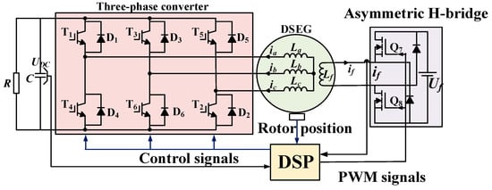 The DSEG system is composed of a 12/8 pole DSEG, an asymmetric H-bridge driving the field windings, a three-phase converter, a digital signal processor (DSP), a filter capacitor, etc. As shown in Figure 3, the sensors feed the DC-link voltage UDC and the field current in real time back to the DSP. In order to maintain the DC-link voltage at 270 V, the double closed-loop proportion–integral–derivative (PID) controller is used. The outer loop controls the DC-link voltage and the inner loop controls the field current. The output result of the PID controller is the duty cycle of the PWM, which is used to control the field current and regulate UDC.