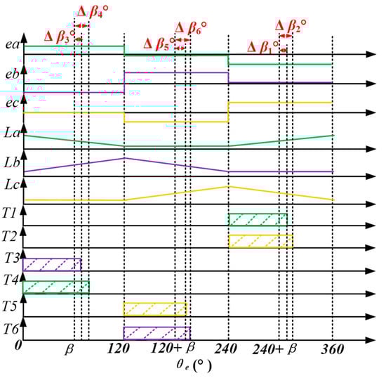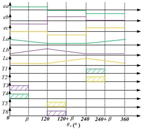 APC is an effective method for improving the performance of the DSEG system. Figure 4 shows the three-phase electromotive forces and the three-phase self-inductances. The conduction principle of APC is also demonstrated. In each electrical cycle, the phase self-inductance can be divided into three zones with 120° equal widths, namely, the rising zone, the falling zone, and the constant value zone. β° is defined as the conduction angle.