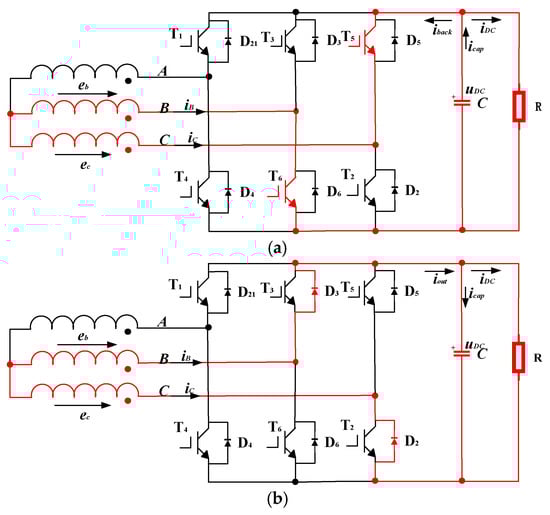 Taking 120°~240° as an example, the B-phase is in the falling zone, the C-phase is in the rising zone, and the insulated gate bipolar transistors (IGBTs) of the C-phase upper bridge arm and B-phase lower bridge arm are conducting and then turned off after β°, as shown in Figure 5a. In 120°~120 + β°, the B-phase voltage is negative and the C-phase voltage is positive. eb and ec are the back-EMFs of the B- and C-phases, respectively. The phase windings are connected to the capacitor in reversed direction through T5 and T6. The filter capacitor provides the required current iDC for the load and generates the current iback to the B- and C-phases. The discharge current of the filter capacitor is icap: