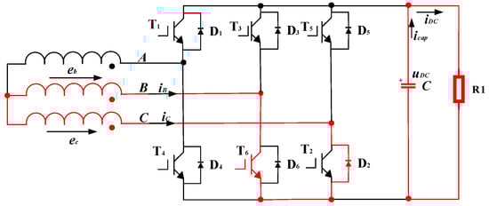 In 120 + β°~240°, the B- and C-phases are connected to the capacitor through D3 and D2, as shown in Figure 5b. The phase current iout charges the filter capacitor while providing current to the load, and icap is the charge current of the filter capacitor. In this case, iout is the sum of icap and iDC.
