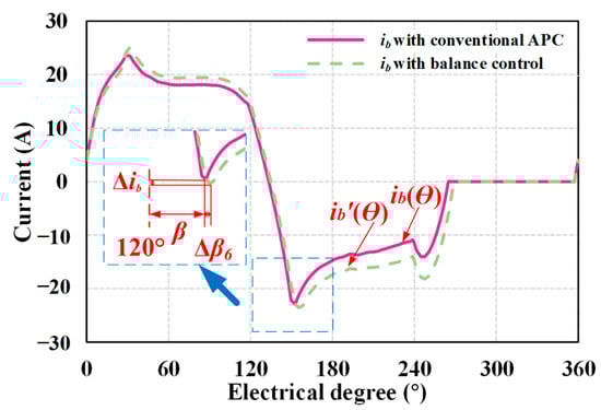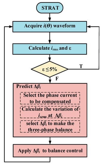 where Δibrms is the increased RMS value of the B-phase current under three-phase balance control. n is the number of steps taken to calculate the RMS value of the current. θ is the electrical degree, as shown in Figure 7. First, i(θ) is obtained with the APC method. The RMS values and ε of the three-phase currents are calculated. If ε is higher than 5%, adopt the three-phase current balance control method (Figure 8). Taking the A-phase current as a standard, the B- and C-phase currents are adjusted. ∆βi is estimated using (18).