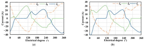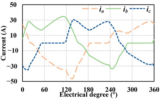 The A-phase current reached saturation first. The temperature was high, and the stress on the power electronic equipment of the A-phase was relatively high. Therefore, the power electronic components connected to the A-phase were easily damaged. The B-phase and C-phase windings could not be used to their limits. When β was 10°, at a fixed and uniform conduction angle, as shown in Figure 10b, the unbalance degree was still relatively high. The RMS values of the three-phase currents were iarms = 20.04 A, ibrms = 16.27 A, and icrms = 17.74 A. The unbalance degree was 21.0%.