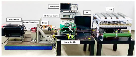 In order to validate the proposed method, comparison experiments were conducted at several common speeds to analyze the output capacity of different control methods. The experimental platform is shown in Figure 12. The operating speed n, load rL, phase current ip, and DC-link current iDC were used to evaluate the load capacity of the DSEG. First, experiments with a diode rectifier were carried out to record the phase currents, DC-link voltage, and DC-link current. The RMS values of the three-phase currents were calculated in real time. The difference between the three-phase currents was calculated, and ∆βi° was calculated with (18). The corresponding lower bridge arm conduction angle β was selected by the controller. The RMS values of three-phase currents were balanced so that the maximum output power capacity was improved.