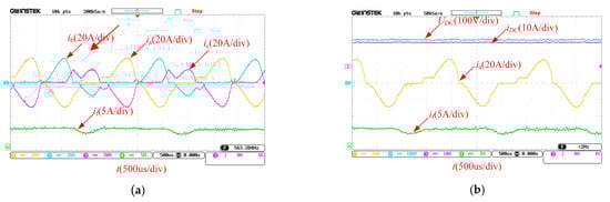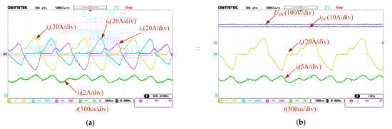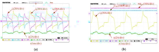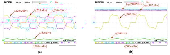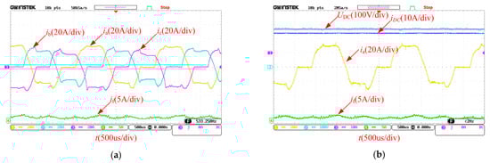 Based on the APC method (β = 50°), when the speed was 4000 r/min, the output power capacity was 4.32 kW, and the waveforms of ia, ib, ic, UDC, iDC, and if are shown in Figure 16. iarms, ibrms, and icrms were 20.2 A, 15.6 A, and 19 A, respectively. if, UDC, and ε were 3.05 A, 270 V, and 19.2%, respectively. The A-phase current was much higher than the B-phase current. The unbalance degree was relatively reduced, but the B- and C-phases could not be fully used.