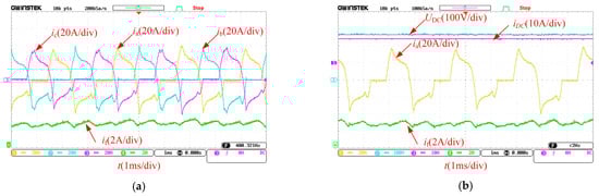 Based on the diode rectifier, when the speed was 4000 r/min and the maximum output power capacity was 3.71 kW, the waveforms of ia, ib, ic, UDC, iDC, and if are shown in Figure 13. The A-phase current was much higher than the B-phase current, and the three-phase currents are extremely unbalanced. The RMS values of the A-, B-, and C-phase currents were 16.2 A, 11.6 A, and 12.8 A, respectively. The field current if was 5.98 A, and the DC-link voltage UDC was 261 V. Due to the limitation of the output capacity at the speed used, the DC-link voltage did not rise to 270 V, and the unbalance degree ε was 39.6%, and thus, relatively high.