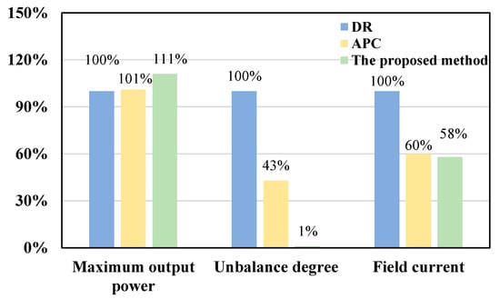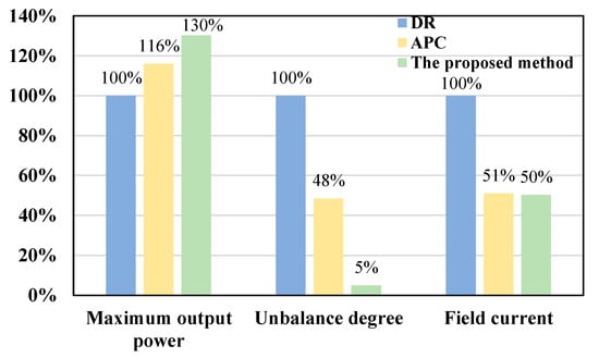 In Figure 19 and Figure 20, the performance of the three control methods is compared under different operating speeds. The diode rectifier was used as the reference scheme. Compared with the two conventional control methods, the APC method could slightly improve the three-phase current unbalance but the three phases could be fully used. The proposed method could effectively reduce the unbalance of the three-phase currents and improve the output power capacity of the DSEG to the current density limit. As the speed increased, the increasing effect of the APC and the proposed method of the maximum output power was gradually weakened. The reduction effect of the two methods on the unbalance degree increased, while the reduction effect on the field current gradually decreased. The output capacity of the proposed method was consistently better than the APC method at different speeds.