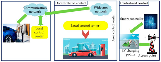 After centralized charging control, the remaining charging of EVs is based on a decentralized control strategy that uses communication infrastructure. In this controller, the aggregator or system operator does not process charging and discharging commands. Instead, the operator generates signals encouraging participating EVs to take specific actions. Therefore, sending private information from EVs to operators and aggregators is prohibited. EVs are responsible for charging and discharging rates based on their preferences. Figure 6 shows a model for EV charging technology based on two centralized and decentralized controller models [58].