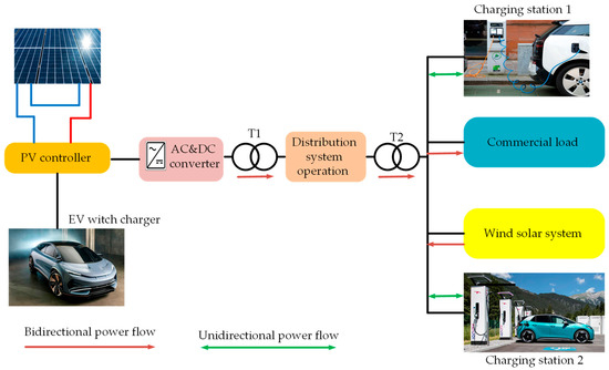 In general, they may have negative effects such as overload, unauthorized overloading of the transformer, line losses, and voltage imbalance on the network [6,7]. The authors, in reference [8], concluded that EVs as controllable loads lead to increased system efficiency and demand side management (DSM). Additionally, in reference [9], the authors conduct studies on EVs providing ancillary services, such as regulation and storage services. This is especially important for electrical energy systems in the presence of a high share of intermittent renewable energy sources, where system inertia is a crucial issue. Additionally, in reference [10], the authors have studied the integrated operation of EVs and renewable energy production in an intelligent distribution system. Authors in two references [11,12] discussed the objectives and types of EV charge and discharge management methods. Reference [13] examines the benefits of integrating EVs with the power grid. In [14], a one-day optimization framework for sustainable energy supply is proposed for an electric vehicle charging park and a hydrogen refueling station equipped with the power to provide hydrogen conversion facilities in a local multi-energy system. Additionally, in [15], the authors provide an instrumental description of the flexibility services at the distribution level that will be able to be supplied by EVs and their requirements. In [16], a comprehensive framework is proposed for the planning and development of mobile energy hubs based on the optimization of life cycle cost, access distance, and parking duration, considering the temporal variation in EV recharging demands. In [17], the authors focused on the issues that exist for the deployment of charging infrastructure. In another research work, the authors demonstrate that machine-learning-based classifiers can show insights about consumer behavior in 72 identified languages, including Chinese [18]. Finally, in reference [2], Kamran et al. investigate the connection of the Vehicle to the Grid (V2G), and the connection of the Grid to the Vehicle (G2V), and discuss different types of charging systems such as induction charging. According to the definition, V2G is a new concept that, as an energy storage technology, can bi-directionally enable the flow of electricity between the EV battery and the power grid [19].