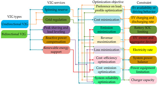 In general, V2G is one of the most important technologies in the electricity industry, which is very useful for energy storage. EV owners will charge their batteries during low demand and inject energy into the grid when needed, helping to meet the needs of electric energy systems. Finally, the smart charging model, which includes V2G in the production system, allows charging EVs during excess electricity generation and battery capacity [48,49].