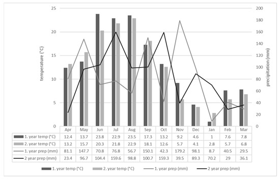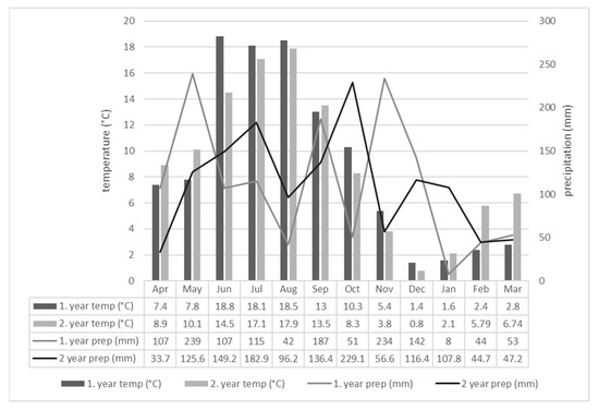In contrast to the Medvednica experimental site, which is located at a much higher altitude, the Maksimir experimental site recorded much higher temperature values and less precipitation for the same period. In the first year of the experiment, the average temperature was about 13 °C and 81.8 mm of precipitation, while in the second year, the average temperature was half a degree lower and was 12.5 °C, with slightly more recorded precipitation of almost 84 mm. Figure 1 shows agroclimatic conditions for the Medvednica experimental fields and Figure 2 for the Maksimir experimental fields. Both graphs contain data with average values of daily temperatures and precipitation per month.