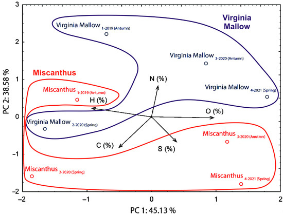 Principal component analysis (PCA) was carried out in order to present the share of an individual element with regard to the harvest date as vividly as possible. The analysis was successfully used to classify and separate different samples in factor space (based on the proportion of each element). The detection of similarities in the studied parameters is based on experimental values and classified according to their results in the factor space of the coordinate system. The results of the elemental composition of Miscanthus (M) and Virginia Mallow (VM), i.e., the measured parameters (descriptors), are shown graphically in Figure 3 using the PCA. The graph shows the successful separation of 8 samples ((M1)-Miscanthus1-2019(Autumn), (M2)-Misanthus2-2020(Spring), (M3)-Misanthus3-2020(Autumn), (M4)-Miscanthus4-2021(Spring), (VM1)-Virginia Mallow1-2019(Autumn), (VM2)-Virginia Mallow2-2020(Spring), (VM3)-Virginia Mallow3-2020(Autumn), and (VM4)-Virginia Mallow4-2021(Spring)). The most positive influence on the PC1 coordinate was observed for O (based on correlations, 41.91%) and S content (8.13%), while the most negative influence was observed for H (38.84%) and C content (10.80%). The most positive influence on the PC2 coordinate was observed for N content (38.14%), while the most pronounced negative impact on the PC2 coordinate calculation was observed for C (36.84%) and S content (22.61%). The most pronounced differences between samples were observed according the PC1 coordinate, which showed that VM3 (44.03%), VM4 (45.23%), M3 (43%), and M4 (42.7%) were characterized with increased O content, while samples VM1 (6.14%), VM2 (6.19%), M1 (6.07%), and M2 (6.12%) were characterized by increased H content. The most pronounced N content was observed for VM1 (0.59%) and VM3 (0.39%) samples, while the most C and S content were noticed for M2 (52.62%; 0.1%) and M4 (51.6%; 0.17%) samples.