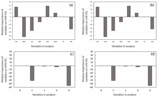 To determine the optimal set of samples (input variables) in the model, Yoon’s global sensitivity method [52] was performed to determine the relative importance of the input variables on the output (Equation (2)) HHV and LHV: