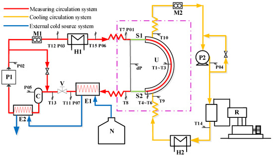 Liquid nitrogen served as the working medium in the external cold source system. After the flow of the test sample, the C1/C2 mixture refrigeration in the measuring system was a vapor–liquid two-phase. To ensure that the C1/C2 at the inlet of the P1 was liquid phase, a large amount of low-temperature cooling must be provided. Liquid nitrogen was stored in a liquid nitrogen tank (N), and the flow of liquid nitrogen into the heat exchanger E1 and E2 was controlled by the regulation of the flow control valve to provide cooling capacity for the C1/C2 working medium and supercool it.