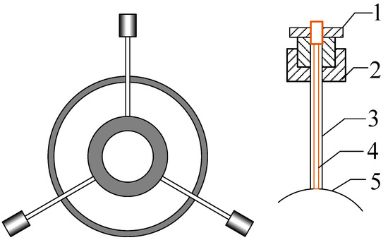 Layout of temperature sensor. 1—Sensor connector, 2—valve seat, 3—copper sleeve, 4—sensor probe, 5—Out wall of inner tube of test sample.