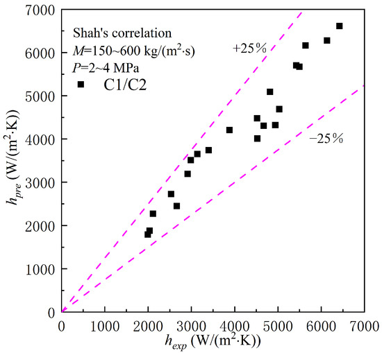 Comparison of heat transfer coefficients between Shah’s correlation and experimental results.