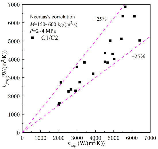 Comparison of heat transfer coefficients between Neeraas’s correlation and experimental results.