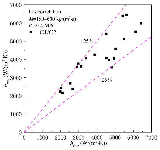 Comparison of heat transfer coefficients between Li’s correlation and experimental results.