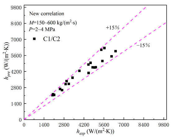 After the development of the correlation, the accuracy of the novel correlation should be verified, and the remaining experimental data were used to verify the accuracy of the developed correlation. The specific results are presented in Figure 7.