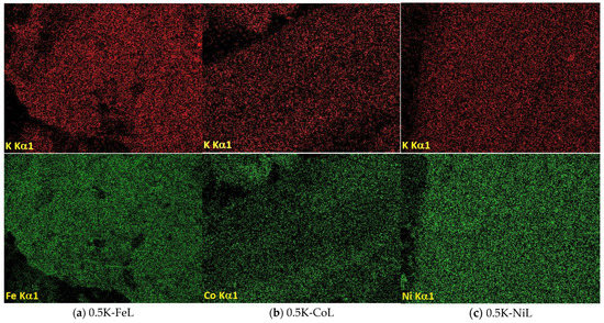 SEM images of the samples containing 0.5 wt.% K and (a) Fe, (b) Co or (c) Ni, and the element distribution maps.
