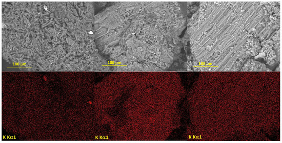 All the samples of lignin with deposited active phases were investigated by SEM with EDX (Figure 2, Figure 3, Figure 4 and Figure 5). Figure 2 shows the distribution of potassium on the surface of lignin. The sample 0.5K-L contains the smallest amount of local potassium agglomerates, the sample 1K-L demonstrates larger amounts of such agglomerates and the sample 3K-L contains many separate areas with a significantly larger potassium concentration. Additionally, it can be noticed that all the samples demonstrate relatively large silica particles with a size of up to 8 nm.