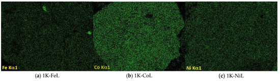 SEM images of the samples containing 1 wt.% K and (a) Fe, (b) Co or (c) Ni, and the element distribution maps.
