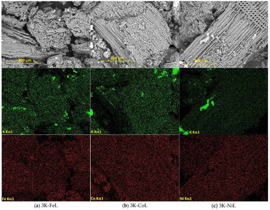 SEM images of the samples containing 3 wt.% K and (a) Fe, (b) Co or (c) Ni, and the element distribution maps.
