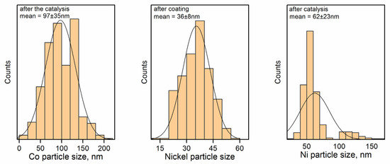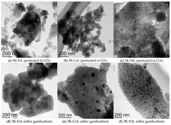 The TEM characterisation (Figure 6) demonstrates that the samples of metal-loaded lignins before the catalytic tests contain particles with different average sizes; observable particles were found in the 3K-NiL sample, while the 3K-FeL and 3K-CoL samples showed no such observable particles, so very small sizes can be tentatively anticipated. After the catalytic tests, the 3K-NiL sample showed nearly no growth in particle size, while in the case of the 3K-CoL sample, large metal particles (up to 100 nm) appeared.