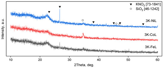 XRD characterisation was performed for the samples before (Figure 8) the catalytic tests of CO2-assisted gasification. In XRD the patterns, the samples after heating in a CO2 flow at 300 °C demonstrate only the reflexes of the potassium nitrite phase and the silica phase, along with a halo at 20–25° corresponding to an amorphous silica. The presence of the reflexes of the KNO2 phase and the absence of the reflexes of KNO3 indicate that the nitrate anion, being a strong oxidant, was reduced by the lignin components during pre-heating. Additionally, the thermal decomposition reaction of KNO3 may take place under these conditions. It can be noticed that the intensities of the reflexes of KNO2 decrease in the following order: 3K-NiL > 3K-FeL >> 3K-CoL. The 3K-CoL sample has such weak reflexes of the KNO2 phase that they cannot be clearly identified. In the case of the 3K-CoL sample, the electron diffraction pattern (Figure 9) shows the presence of a CoO phase that is not seen by XRD.