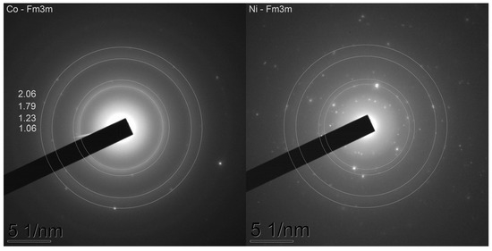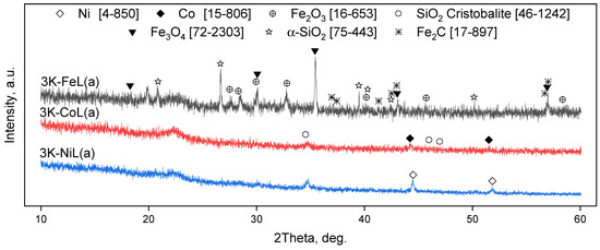 The samples after catalytic gasification were examined by XRD (Figure 10). It can be easily seen that the 3K-CoL and 3K-NiL samples demonstrate a relatively simple phase composition; only the reflexes of metallic Co or Ni can be seen, along with cristobalite and an amorphous halo from amorphous silica. At the same time, the phase composition of the 3K-FeL sample is much more complex; silica is present in the forms of cristobalite, a-quartz and an amorphous silica phase. Iron species consist of magnetite (Fe3O4) and Fe2O3 according to the diffraction patterns [56], in addition to the Fe2C phase. Its formation can be explained by the presence of large amounts of carbon in the sample. The formation of carbides for iron catalysts is also reported in different works, for example, [57]. Since the cristobalite phase is stable at temperatures above 1470 °C according to the phase diagram for SiO2 [58], it is proposed that the local temperature during gasification may be high enough to let this phase form. Additionally, the presence of the metallic states of cobalt and nickel in the samples after catalytic CO2-assisted gasification (3K-CoL and 3K-NiL) was proven by an electron diffraction analysis (Figure 11).