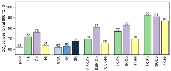 Taking into account the results of the comparison of the conversions of CO2 at 800 °C, in the case of the samples with 3 wt.% K loading, the order of the samples by decreasing conversion is Fe > Co > Ni, and this dependence is not consistent with the results for the other two series (also at 800 °C). Nevertheless, the integral yields of the conversion (Figure 13 and Figure 14) are consistent with the results of the series with 0.5 and 1 wt.% K loading.