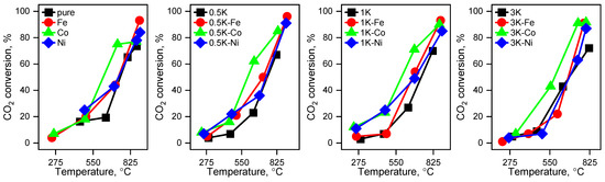 All the catalytic materials were tested in CO2-assisted gasification (Figure 12 and Figure 13). It can be easily seen that almost all the samples demonstrate activities higher than that for the blank test of just lignin without any additional salts. The exceptions are only the 0.5K-L and 1K-L samples. In the case of fixed potassium loading, a lower catalytic activity was seen for Ni-loaded samples, a higher activity was observed for Fe-loaded ones and the most active samples were Co-loaded catalytic materials. Noticeably, the samples loaded with only transition metals demonstrated increases in CO2 conversion of 10 and 14% for Fe and Co, respectively. At the same time, when loaded with potassium nitrate, these metals demonstrated synergism and demonstrated a 30 and 29% CO2 conversion increase, respectively.