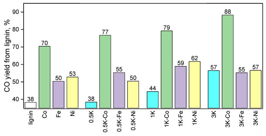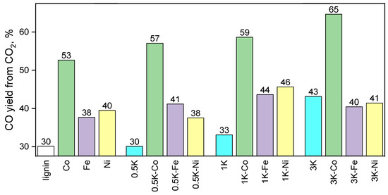 The yields of CO were revealed both on the basis of CO2 (the efficiency of its transformation) (Figure 13) and on the basis of carbon from lignin (Figure 14) by the integration of material flows over the temperature range of 500–800 °C. As can be seen, the highest conversions took place for the samples loaded with Co (88% vs. 55–57% for the 3K-Co, 3K-Fe and 3K-Ni samples, respectively).