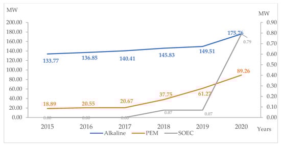 Global installed electrolysis capacity by technology, 2015–2020, MW. Source: [50].