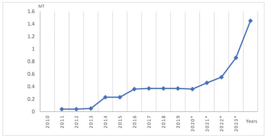 - IEA. Low-Carbon Hydrogen Production, 2010–2030, Historical, Announced and in the Sustainable Development Scenario, 2030–Data & Statistics; IEA: Paris, France, 2022; Available online: https://www.iea.org/data-and-statistics/charts/low-carbon-hydrogen-production-2010-2030-historical-announced-and-in-the-sustainable-development-scenario-2030 (accessed on 15 March 2023).