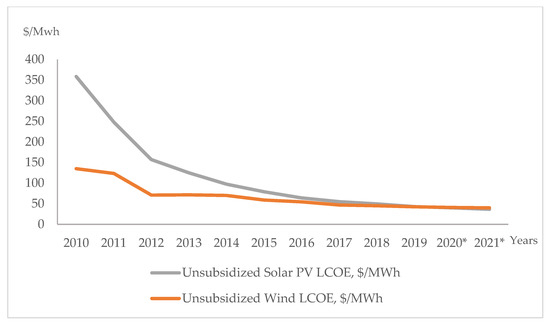 The analysis of the dynamic of the cost of unsubsidized solar and wind energy was based on open data sources (as opposed to confidential company data) (Figure 3). According to a report by the United Nations and Bloomberg (BNEF), the average “present value” or total cost of producing solar energy worldwide before the pandemic fell by 17%, the costs for onshore wind energy fell by 18%, and the costs for offshore wind wing energy fell by 28% [66].
