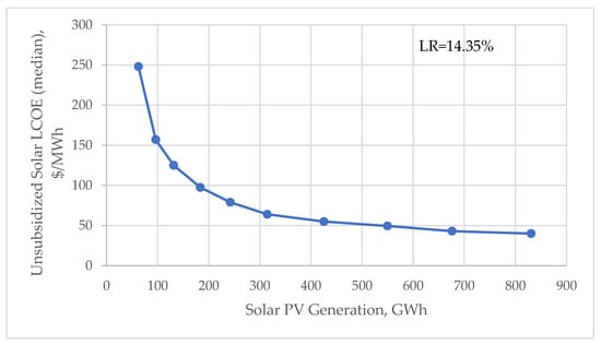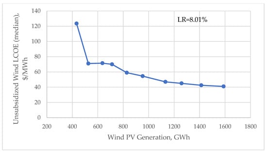 For learning rates calculation, we used data on unsubsidized LCOE of wind and solar energy in 2011 and 2020 [54] and Electricity Generation Solar PV and Wind [52,53] (Figure 4 and Figure 5).