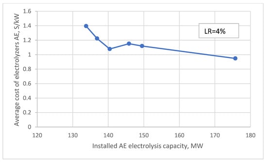 The assessments of the electrolyzers’ cost in the literature also vary greatly. Recent IEA report [2] asserts that electrolyzer installations cost USD 1000–1750 per kilowatt (2020). At the same time, the IEA indicates (referring, however, to the Hydrogen Council [67]) that by 2030, the cost will fall sharply in all scenarios and will be somewhere in the range of USD 400–600, which is close to the Fraunhofer ISE estimate [51]. An important assumption made in this work is the large scatter of data in the evaluation of the cost of electrolyzers found in various sources. Therefore, we considered the cost of electrolyzers as the second component for assessing the learning rate, which, according to all forecasts, will decrease in the future. It should be noted that AE pots are more common than PEM, but the future still belongs to PEM pots, as they are less sensitive to loading, do not require a stable load profile, allow fluctuations, and, in principle, allow operation in a variable load mode. Calculations were performed for both types of electrolyzers based on CAPEX costs in 2015 and 2020 [38,49,51]. The cumulative production volume is calculated from data of installed electrolyze capacity [50] (Figure 6 and Figure 7). The results are presented in Table 5.
