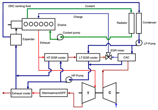 19]. The layout of the system onboard diesel engine with exhaust gas recirculation (EGR) can be seen in