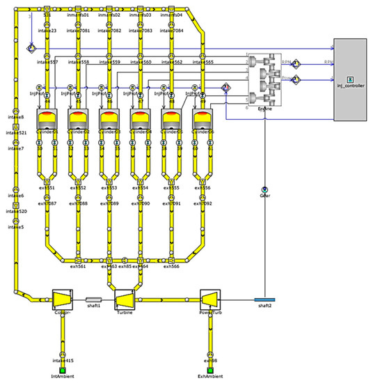 The engine used for this project is a 4-stroke, 6-cylinder, 11.7 L diesel engine with a compression ratio of 16:1. This is representative of typical engines that are currently used, for example, in heavy-duty trucks. The overall engine model can be seen in