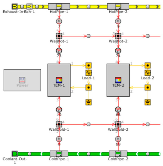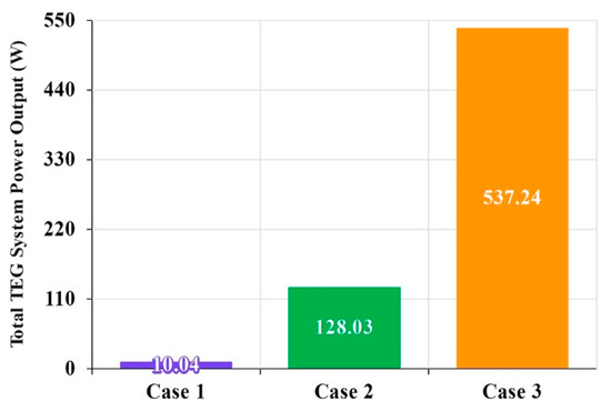 34]. Kim et al. carried out an experiment to test the WHR performance of a TEG showing that the power produced by the TEG increases with engine load and speed. Moreover, a maximum power output of 119 W at 2000 rpm was achieved, as well as a maximum conversion efficiency of approximately 2.8% [