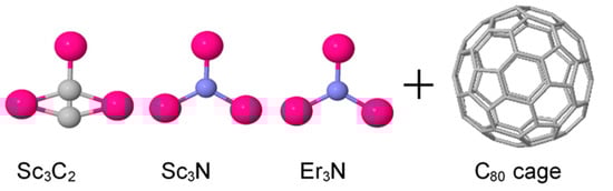 Schematic illustration of three metallic moieties including Sc3C2, Sc3N, Er3N, and Ih-C80 cages (Note: All structures are fully optimised). Insertion of the metallic moiety inside the cage yields EMF complexes such as Sc3C2@C80, Sc3N@C80, and Er3N@C80.