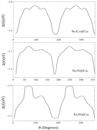 Again, in the erbium nitride configuration (Sc3N@C80 + Au), net charge transfers are significantly larger than those of the scandium nitride and scandium carbide configurations. Table 1 and Table 2 show that the net charge transfers of Er3N are more than four times higher than those of Sc3C2 and Sc3N, and the reason for this is that the erbium nitride moiety possesses f-electrons in its outer orbital shells []. It is widely known that DFT cannot treat electrons in f-orbitals accurately [].
