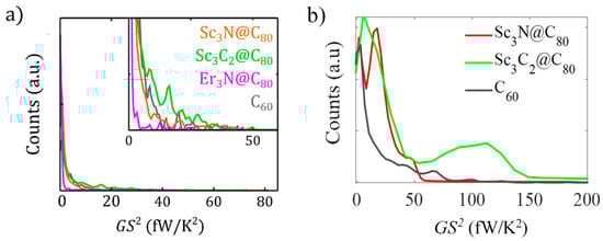 Many experimental and theoretical studies pointed out that EMF–complex junctions retain a high single molecule power factor. For example, Lee and his co-workers [] reported that the Gd@C82 complex has the biggest power factor for a molecular device (at the time of publication), which is about 16.2 fW K−2. This is equivalent to approximately 4 × 10 μW K−2 m−1 for a Gd@C82 monolayer. In another study [] performed in 2022, the researchers noticed a larger PF of 50 fW K−2 for Sc3N@C80 and Sc3C2@C80 complexes, and some measurements hit 70–80 fW K−2 for Sc3N@C80 and Sc3C2@C80 complexes. Statistically, they report larger values for the carbide complex (Sc3C2@C80). Considering all their measured conductance and Seebeck coefficient values, the PF can be statistically improved when the charge transfer becomes larger. We attribute this desirable feature to the CT phenomena. Table 3 above clearly illustrates that the charge transfer of Sc3N@C80 and Sc3C2@C80 complexes are approximately 10 times larger than that of the Er3N@C80 complex, and this explains why their conductance and Seebeck (i.e., power factor ) are larger than those of Er3N@C80, as shown in Figure 4 below (Note: Figure 4 has been reported in our previous work []).